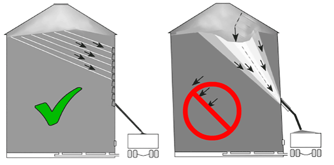 - After unloading through a side discharge and before refilling the bin, unload through the center sump to achieve an inverted cone with level grain depth around the perimeter of the bin.