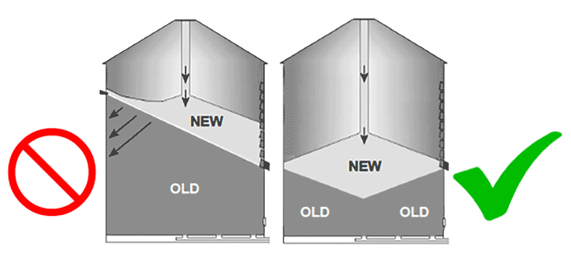 Refilling a bin without first leveling the existing old grain can create uneven sidewall pressures and possible bin failure.